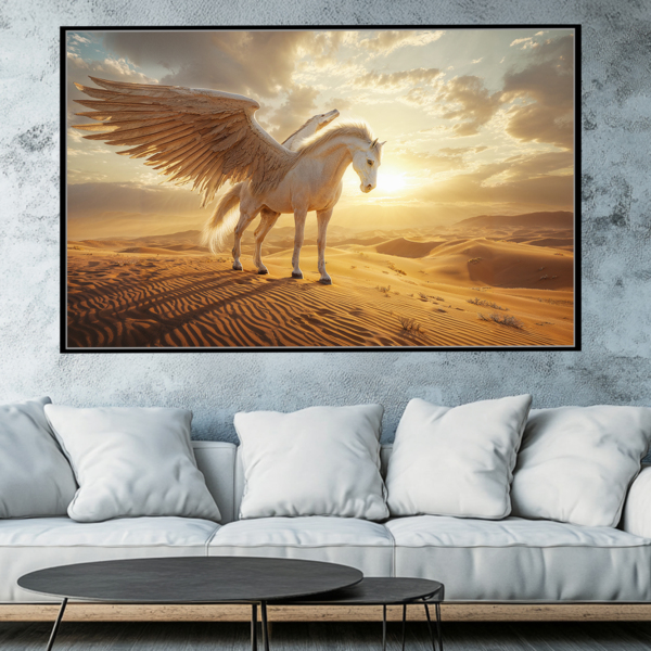 This painting takes you on a journey to a world of legends and absolute beauty, where a majestic winged horse stands tall in a desert bathed in golden sunlight. The artwork embodies the spirit of boundless freedom and the power of dreams that soar beyond the limits of reality. It is more than just a painting; it is a window into a realm of inspiration and greatness, inspiring all who see it to strive for what lies beyond the impossible.