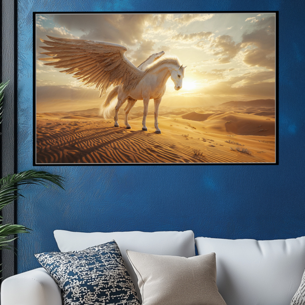 هذه اللوحة تأخذك في رحلة إلى عالم الأساطير والجمال المطلق، حيث يقف الحصان المجنح شامخًا في صحراء تغمرها أشعة الشمس الذهبية. تجسد اللوحة روح الحرية التي لا تعرف القيود، وقوة الأحلام التي تحلّق فوق حدود الواقع. إنها أكثر من مجرد لوحة، إنها نافذة على عالم من الإلهام والعظمة، تُلهم كل من يراها للسعي نحو ما هو أبعد من المستحيل